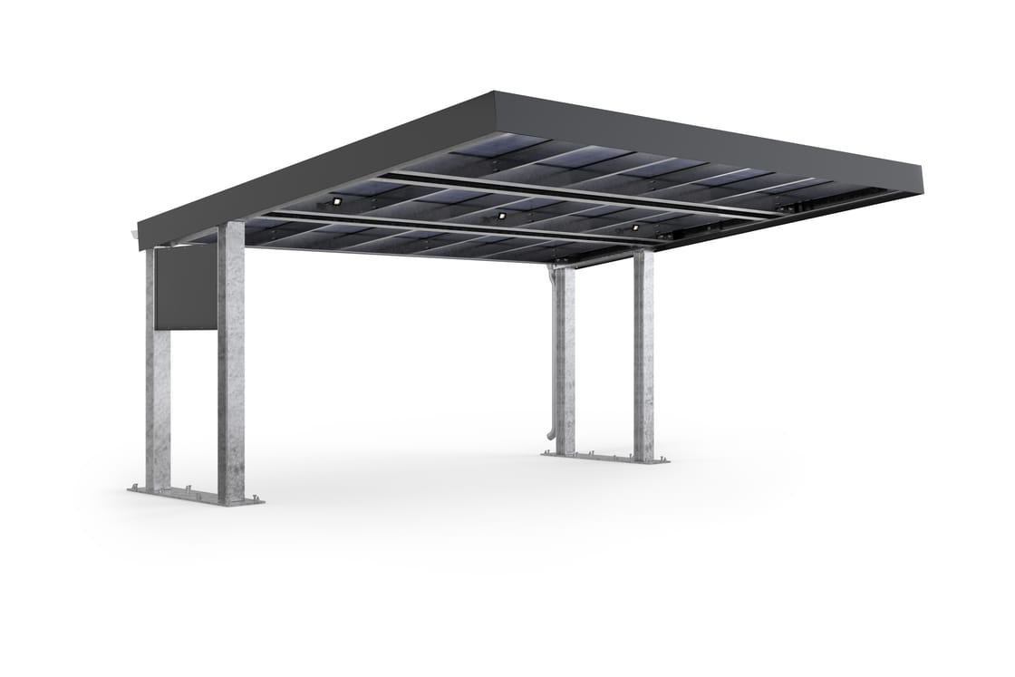 Qualität in Metall: Solide gefertigte, verzinkte Stahlkonstruktionen und eine langlebige Eindeckung aus 5 mm Glas-Glas-Modulen bieten einen wirtschaftlichen Schutz für viele Jahre.